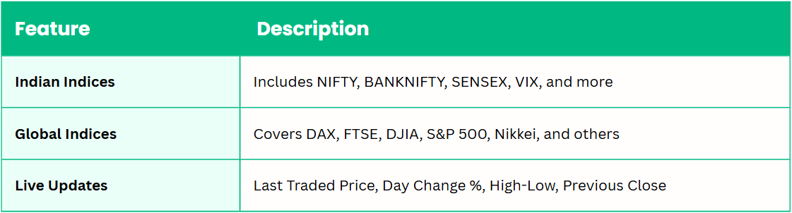 Whether you trade NIFTY or track the Dow Jones, our latest indices section helps you stay on top of every market movement — both local and global.
